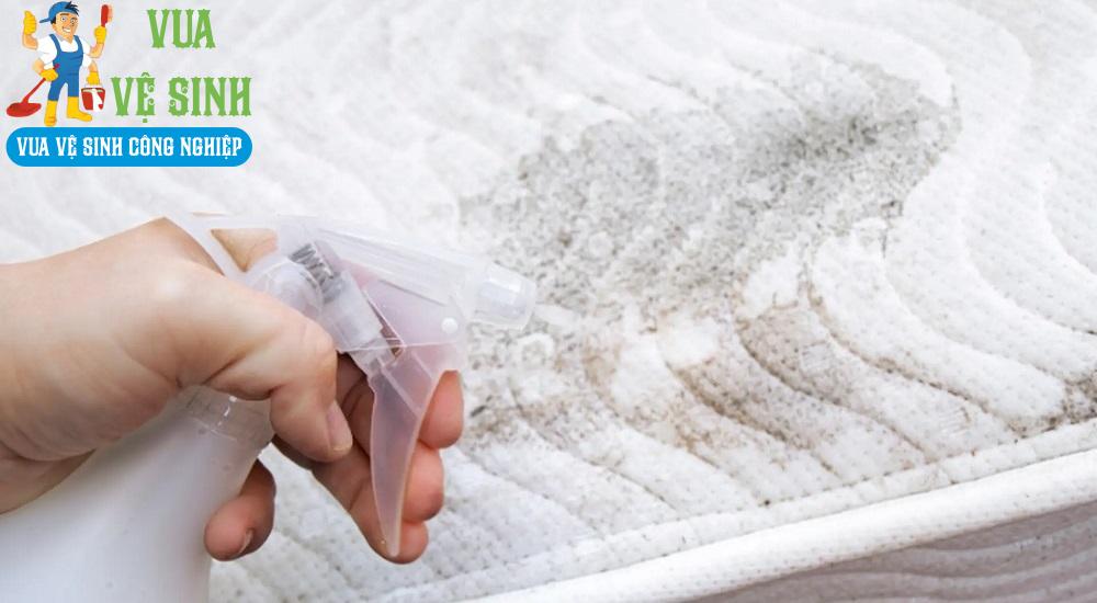 Bước 4: Phun dung dịch giặt nệm chuyên biệt: Phun đều dung dịch giặt nệm chuyên biệt với từng vật liệu lên bề mặt nệm để làm sạch vết bẩn, diệt khuẩn, đồng thời đảm bảo an toàn cho sức khỏe người dùng.