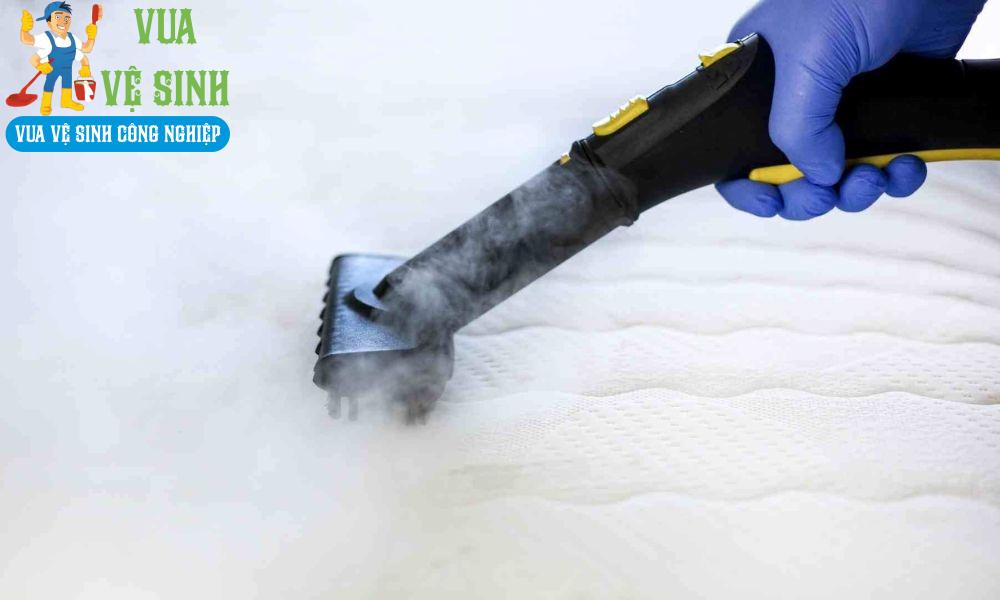 - Bước 3: Vệ sinh bằng hơi nước nóng: Hơi nước nóng được phun lên bề mặt nệm giúp làm mềm vết bẩn bám lâu, đồng thời tiêu diệt vi khuẩn và nấm mốc mà không làm ảnh hưởng đến độ đàn hồi của nệm.