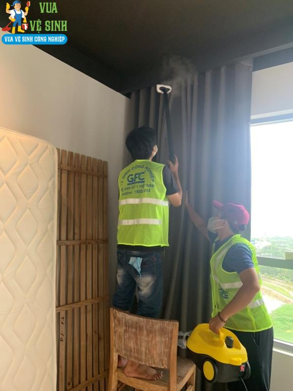 Nhân viên vệ sinh làm sạch rèm cửa bằng các dung dịch chuyên dụng, có chất lượng cao nhằm đảm bảo loại bỏ hoàn toàn bụi bẩn. Việc giặt sẽ được tiến hành bằng máy giặt công nghiệp để diệt khuẩn tốt nhất và cũng được xả thơm sau quá trình giặt.